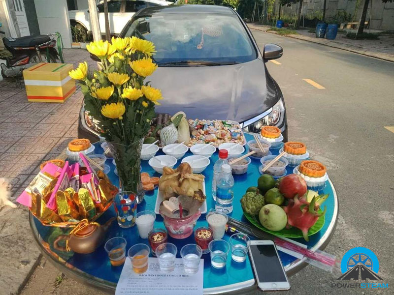 - Chuẩn bị mâm lễ: bình hoa cúc tươi, đĩa trái cây ngũ quả, xôi chè, giấy tiền vàng mã, ba ly rượu trắng và ba ly nước trà. Đặt mâm lễ ngay trước đầu xe, hướng đầu xe ra đường lớn.