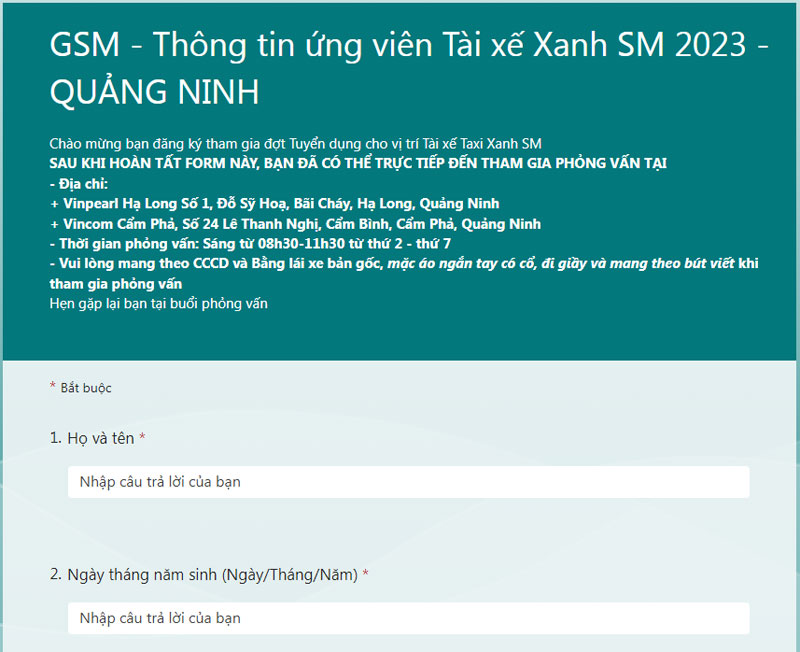 Ngoài việc đăng ký online, bạn cũng có thể nộp hồ sơ trực tiếp tại văn phòng đại diện Xanh SM Quảng Ninh. Tuy nhiên, nếu chưa có thông tin tuyển dụng bổ sung từ GSM, bạn cần xác nhận thông tin trước khi tới điểm đăng ký trực tiếp.