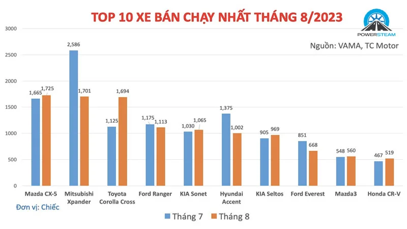 Top 10 xe bán chạy nhất tháng 8/2023, vị trí dẫn đầu bất ngờ gọi tên Mazda CX-5