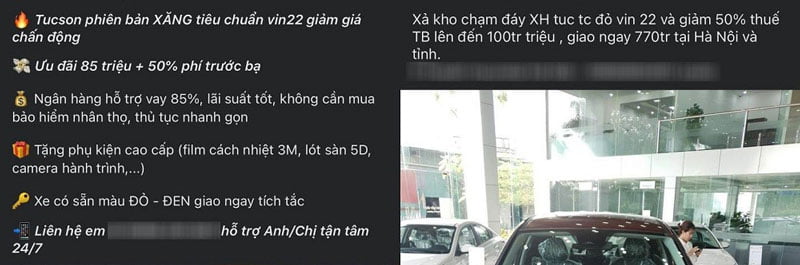 Điều này đã giúp giá bán của nhiều mẫu xe giảm sâu hơn bao giờ hết, ví dụ như Hyundai Tucson. Thông qua các nhóm, hội dành cho người dùng ô tô, không khó để bắt gặp những nhân viên tư vấn bán hàng tại đại lý công bố mức giá hấp dẫn cho các phiên bản của Hyundai Tucson.
